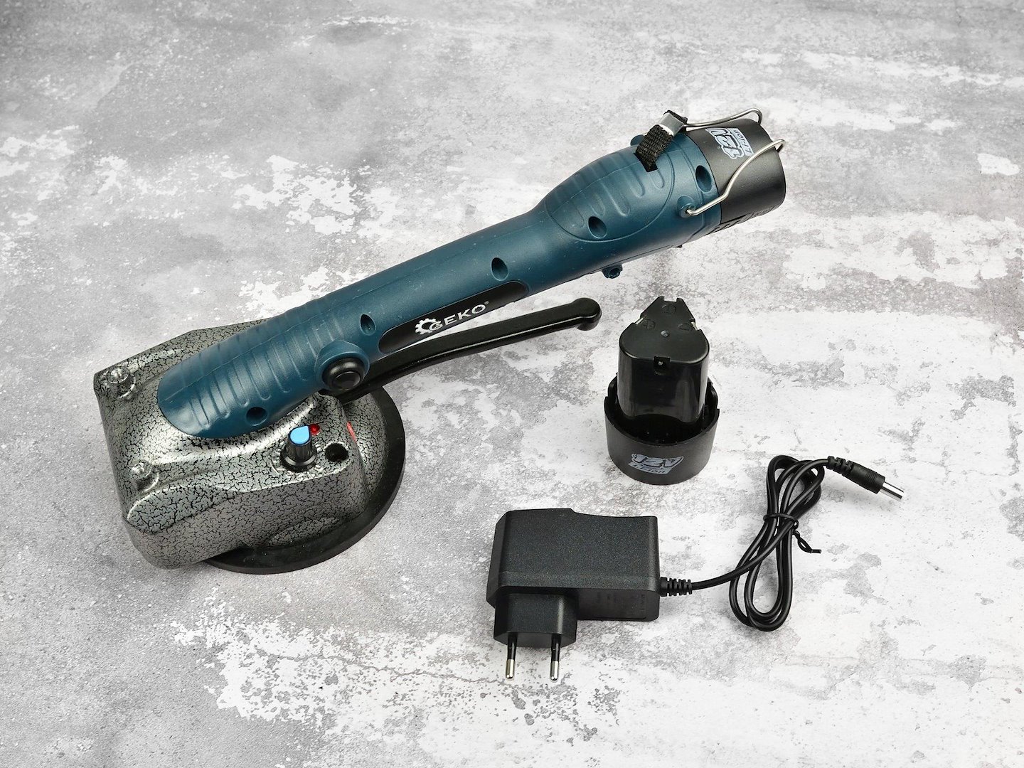 Oppladbar vibrerende sugekopp for flislegging. Utviklet for å overføre og vibrere limet mellom flisen og underlaget for å fordele limet jevnt og fjerne luftbobler. Bruk av den vibrerende sugekoppen forhindrer dannelse av tomme mellomrom mellom flisen og underlaget, noe som sikrer den mest holdbare bindingen mellom flisen og underlaget. Enheten har en knott med 10-trinns vibrasjonskraftjustering. Den robuste sugekoppen lar deg løfte fliser med en maksimal størrelse på 100×100 cm.