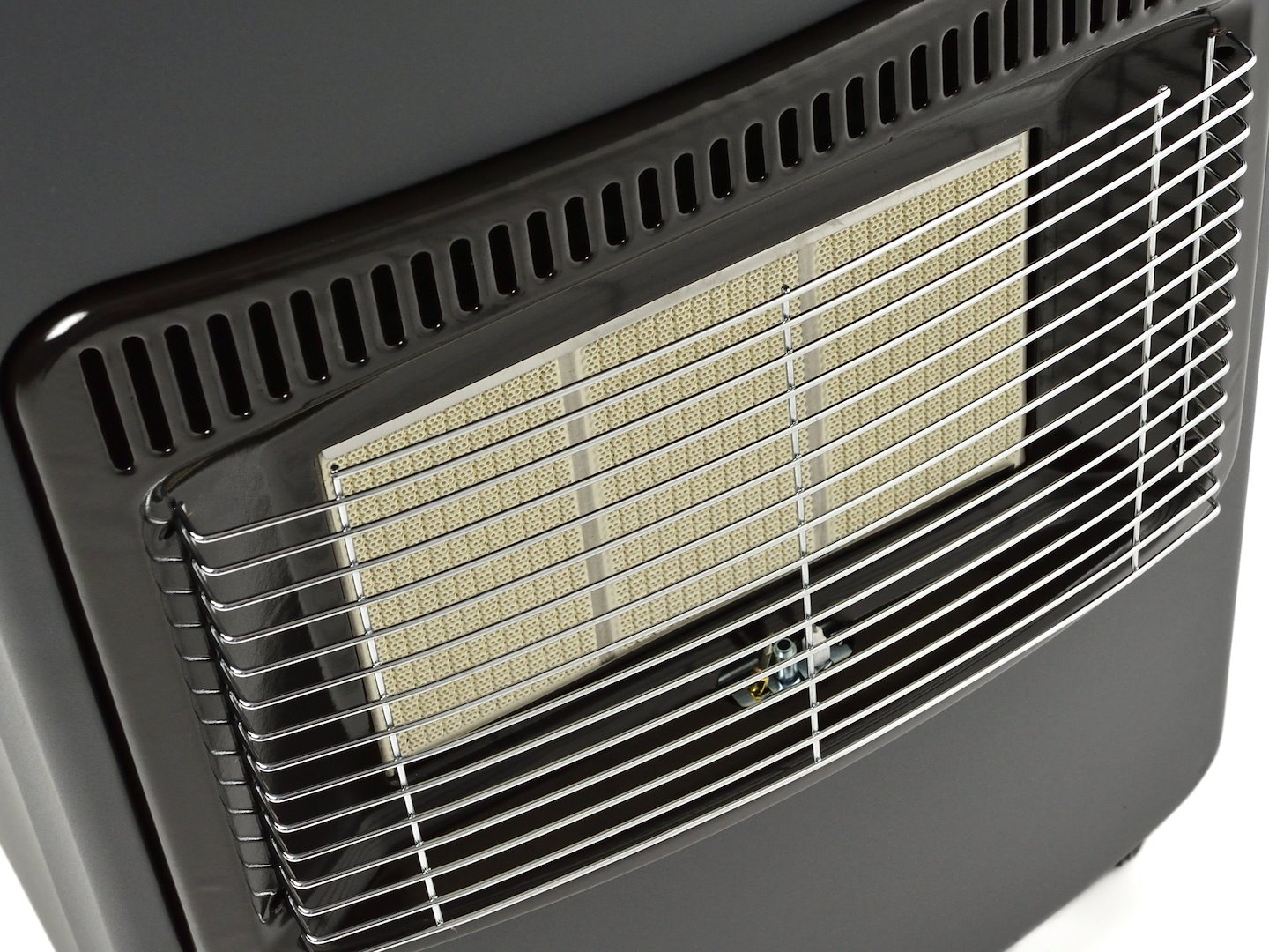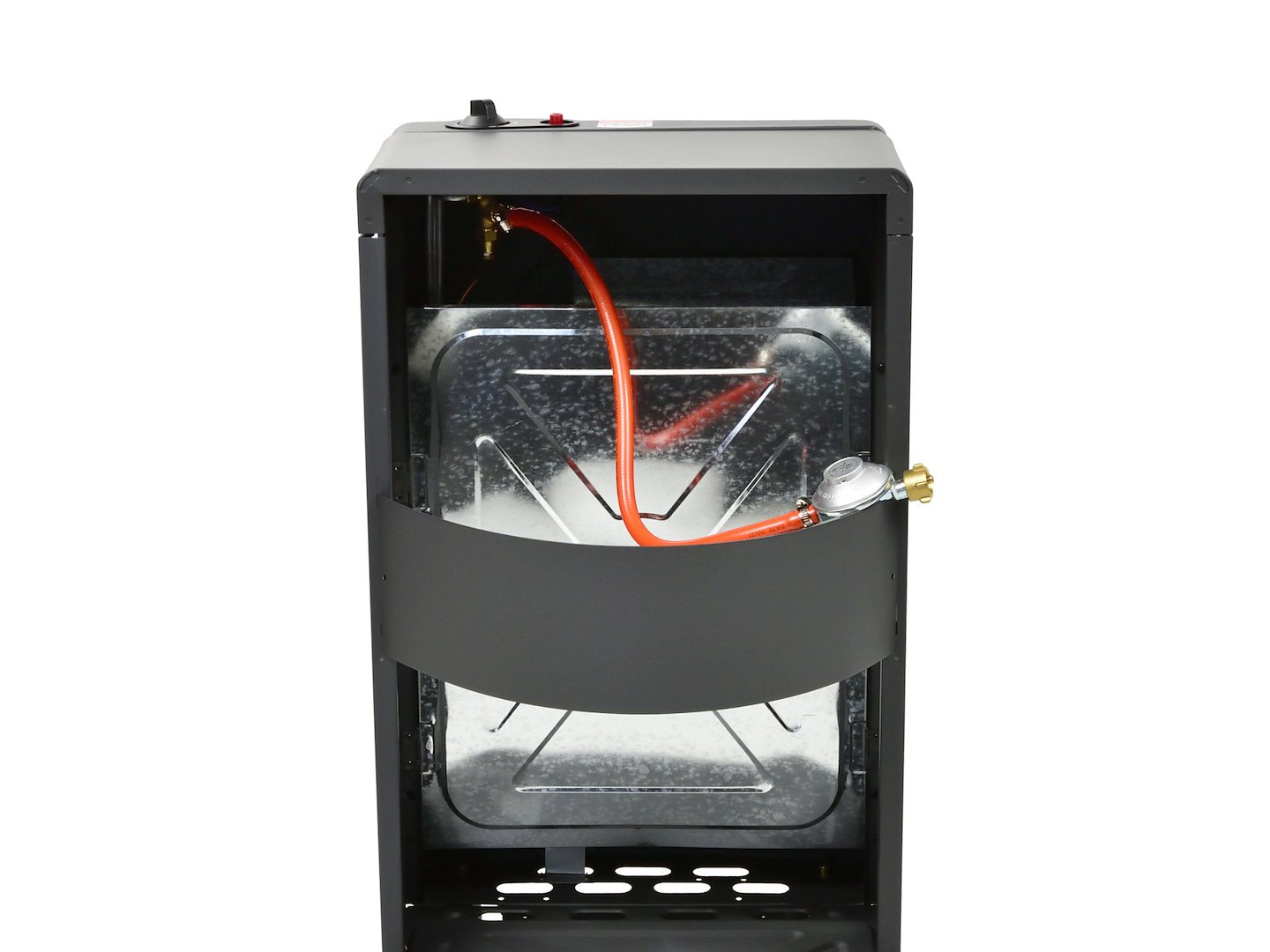 Gassovn; leveres med regulator og slange. Enheten kjennetegnes av en høy varmeeffekt på 4,2 kW. Den drives av en 11 kg propan/butangassylinder. Den er perfekt for oppvarming av mellomstore rom. Varmeovnen er utstyrt med en termoelektrisk sikkerhetsanordning som umiddelbart stenger av gasstilførselen hvis forbrenningen avbrytes. Den har en 3-trinns varmeeffektregulering og en piezoelektrisk tenner. Utstyrt med hjul som gjør at varmeren enkelt kan flyttes, uavhengig av om sylinderen er installert eller ikke.