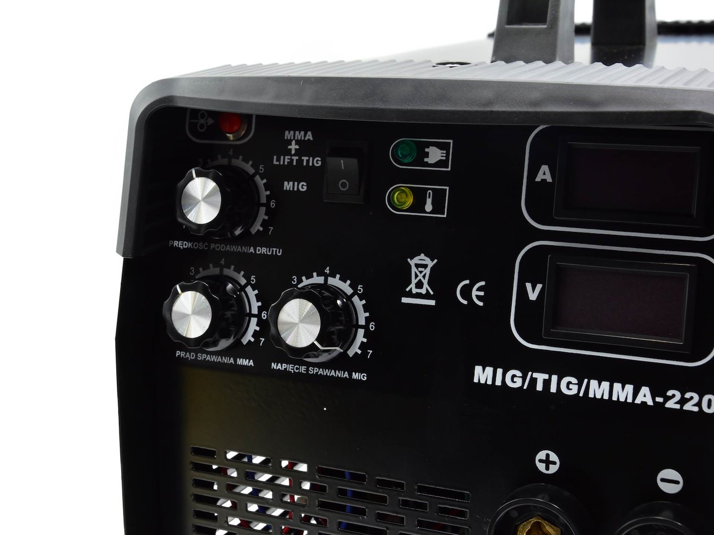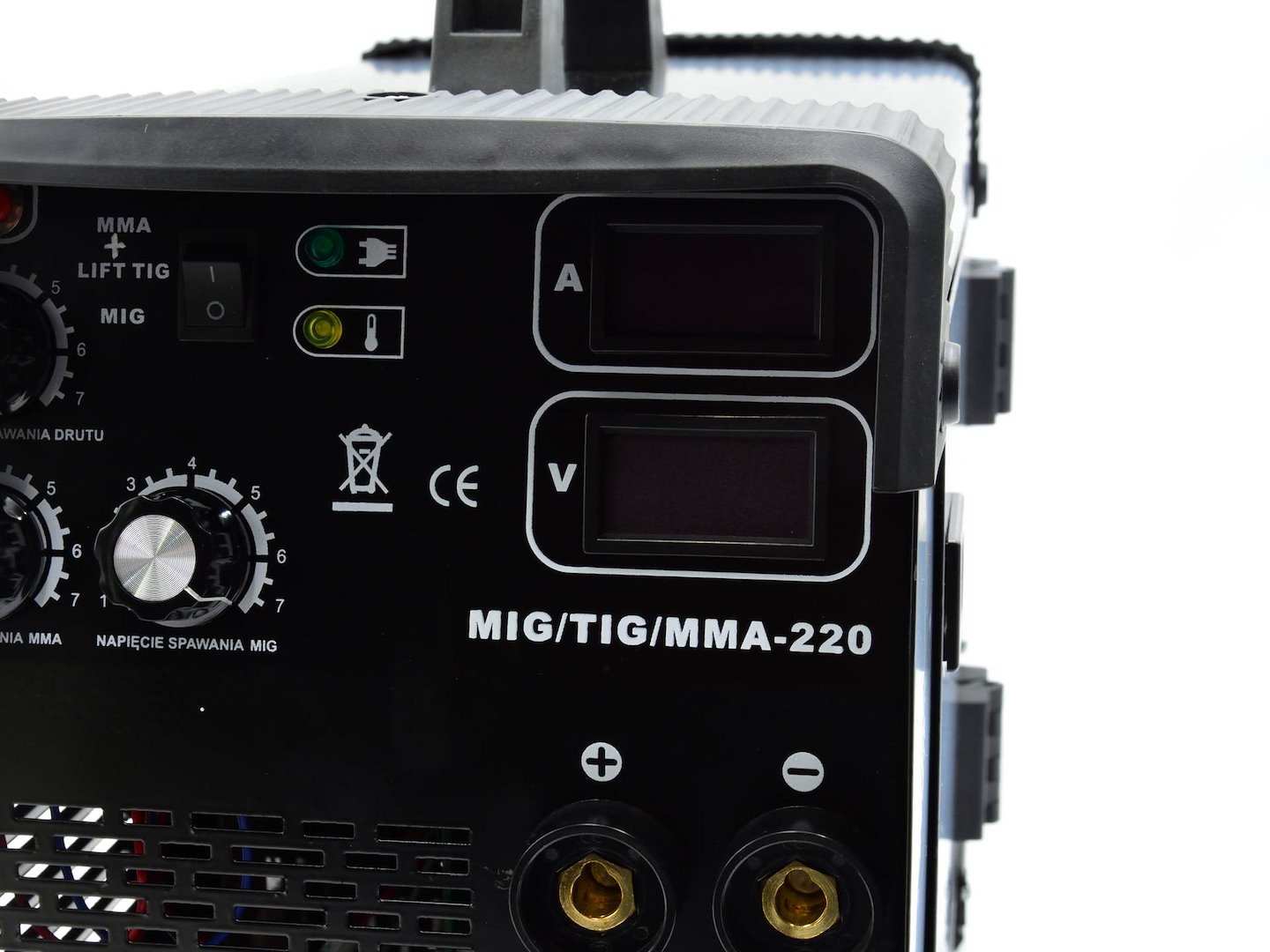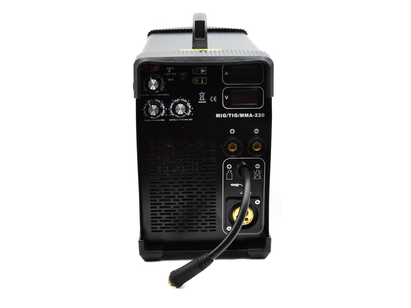 3-i-1-sveisemaskin Denne enheten muliggjør sveising med de mest populære sveisemetodene som: MIG, mmA og TIG (TIG-kabel kreves). Utviklet for sveising av lavkarbonstål, lavlegert stål og legert stål. Denne enheten brukes i metallplatearbeid eller verkstedarbeid.