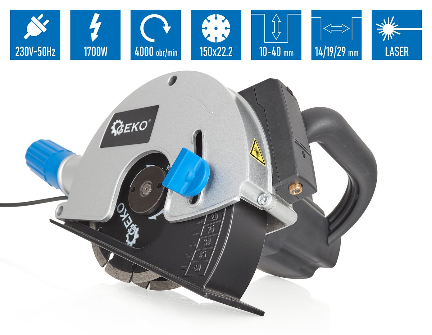 Veggsfresen er utstyrt med en 1700-watts motor, som gir tilstrekkelig kraft til å skjære betong. Takket være den høye motorhastigheten (opptil 4000 o/min) er verktøyet effektivt og virkningsfullt i notskjæringsprosessen.