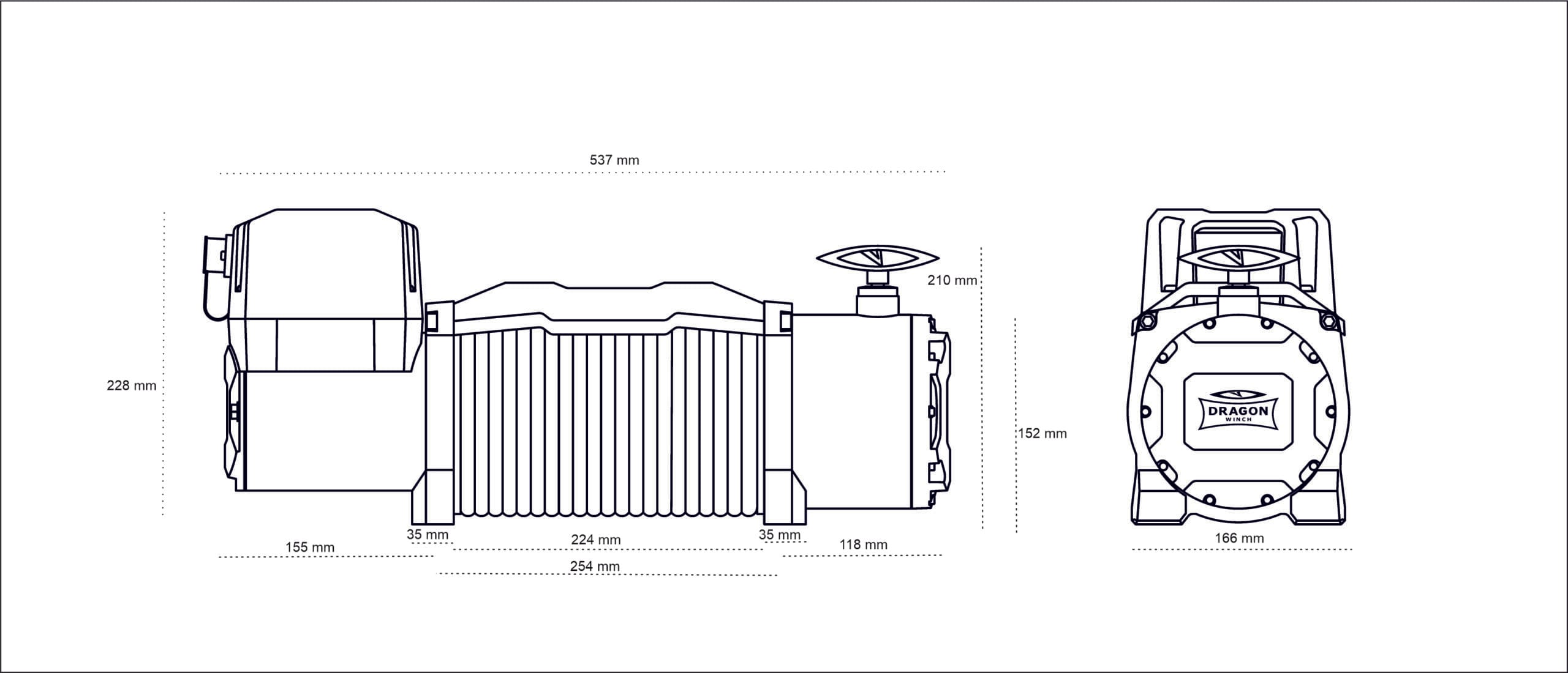 Mål på vinsjen (LxBxH): 537 mm x 166 mm x 228